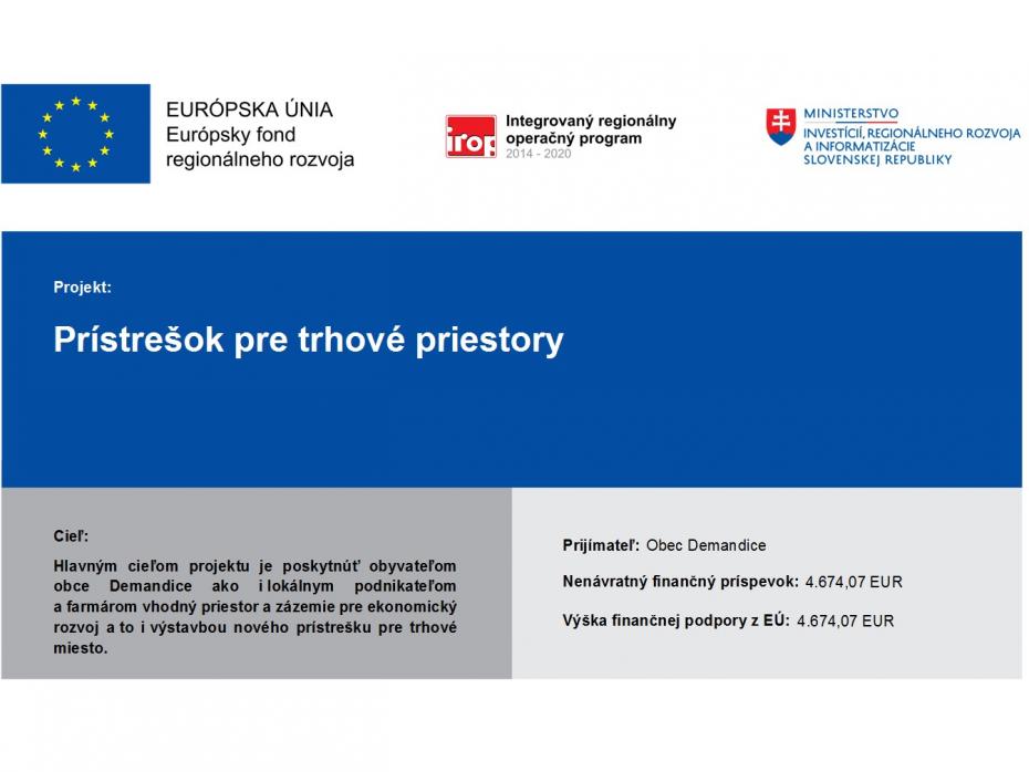 Projekt s názvom „Prístrešok pre trhové miesto“ rieši revitalizáciu miesta v centre obce, ktoré bolo vyhradené pre účely vonkajšieho trhoviska a to konkrétne osadením komplexnej stavby pultov a prístrešku pre trhové miesto. Realizácia projektu prispeje k miestnemu rozvoju a k zlepšeniu verejných služieb v obci Demandice. Cieľom projektu je spojiť obyvateľov obce Demandice a poskytnúť im nový priestor pre rozvoj služieb a taktiež priestor pre rozvoj susedských vzťahov. Hlavnou aktivitou projektu je výstavba prístrešku pre 2 pulty v rámci jedného trhového miesta.